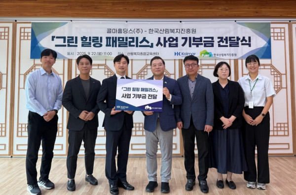 콜마홀딩스는 산후 가족을 위한 산림치유사업 '그린 힐링 패밀리스(Green Healing Families)'를 지원하며, 이를 위해 9월 22일 대전 산림복지종합교육센터에서 한국산림복지진흥원에 기부금을 전달했습니다.